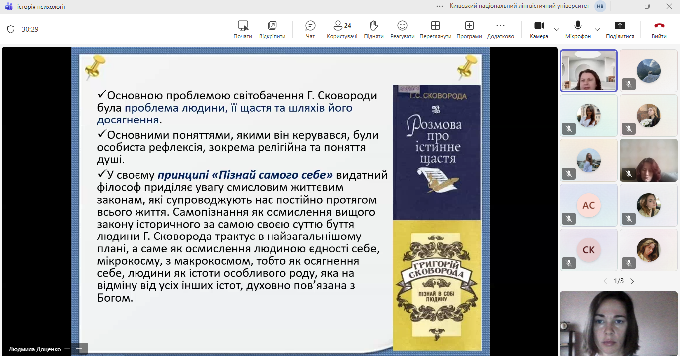20 листопада 2025 р. у Київському національному лінгвістичному університеті було проведено (у форматі онлайн) науковий семінар «Витоки київської психологічної школи», присвячений аналізу історичних передумов формування психологічної науки в Україні та внеску провідних дослідників у становлення національної академічної традиції.