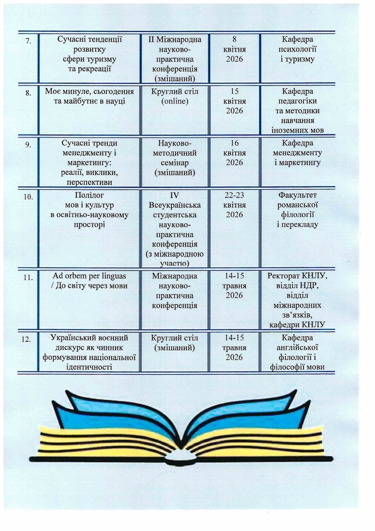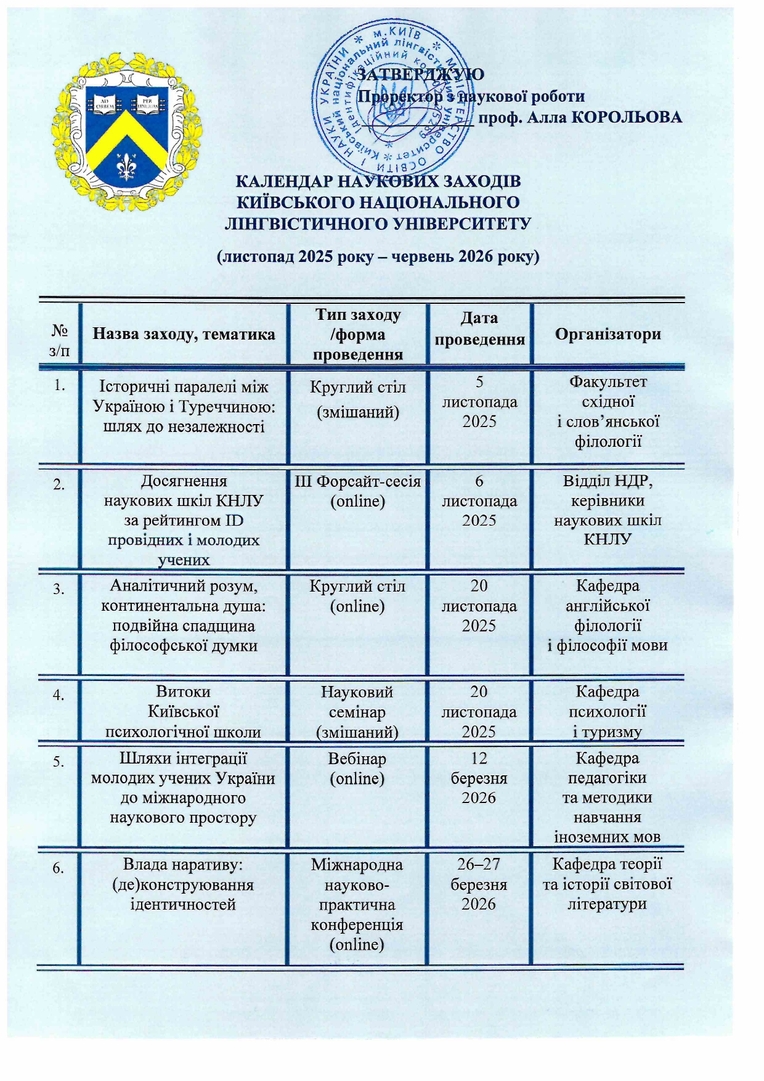 Календар наукових заходів Київського національного лінгвістичного університету (листопад 2025 року - червень 2026 року)