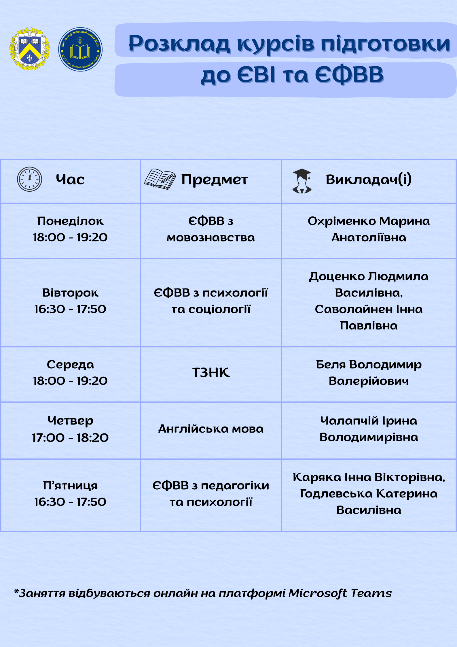 Ми цінуємо Ваш час та комфорт! Навчання відбувається онлайн на зручній платформі Microsoft Teams. Наші викладачі – це кваліфіковані викладачі КНЛУ, які готові ділитися власним досвідом і актуальними знаннями.