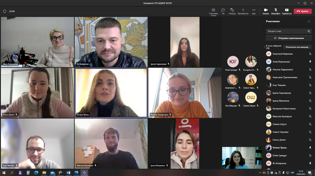 До засідання приєдналася проректор з наукової роботи проф. Алла КОРОЛЬОВА, яка привітала наукову молоду спільноту з початкову нового навчально-наукового року, побажала успіхів новообраній Голові НТСАДіМУ КНЛУ, а також її членам.