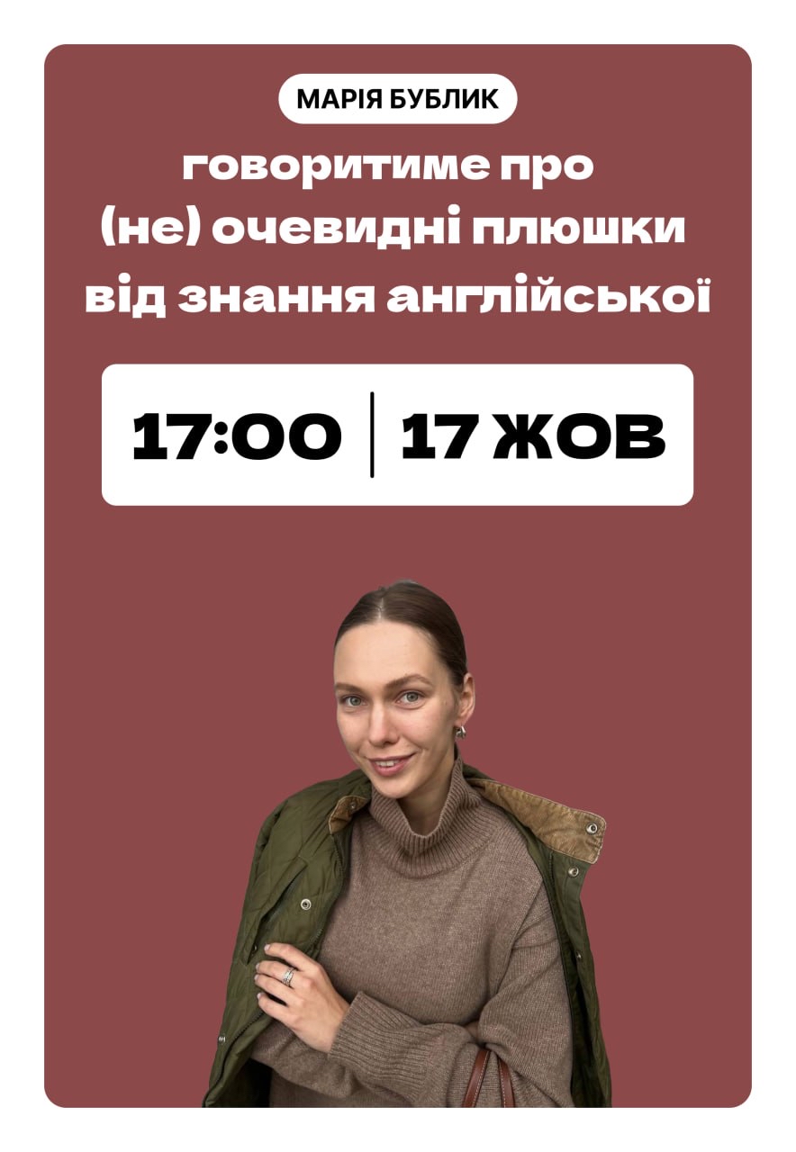 17 жовтня о 17:00 Марія Бублик, засновниця розмовного курсу Let’s Speak! розповість про наступне: