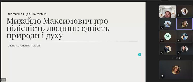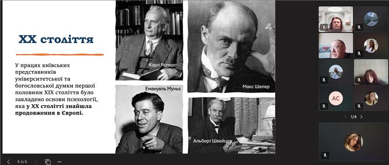 Під час заходу було розглянуто ключові етапи розвитку теоретичної та експериментальної психології в Україні, починаючи з кінця ХVІІІ до початку ХХ століття. Особливу увагу приділили філософським ідеям про цілісність людини Михайла Максимовича, першого ректора Київського університету та його впливу на подальший розвиток психологічної освіти.