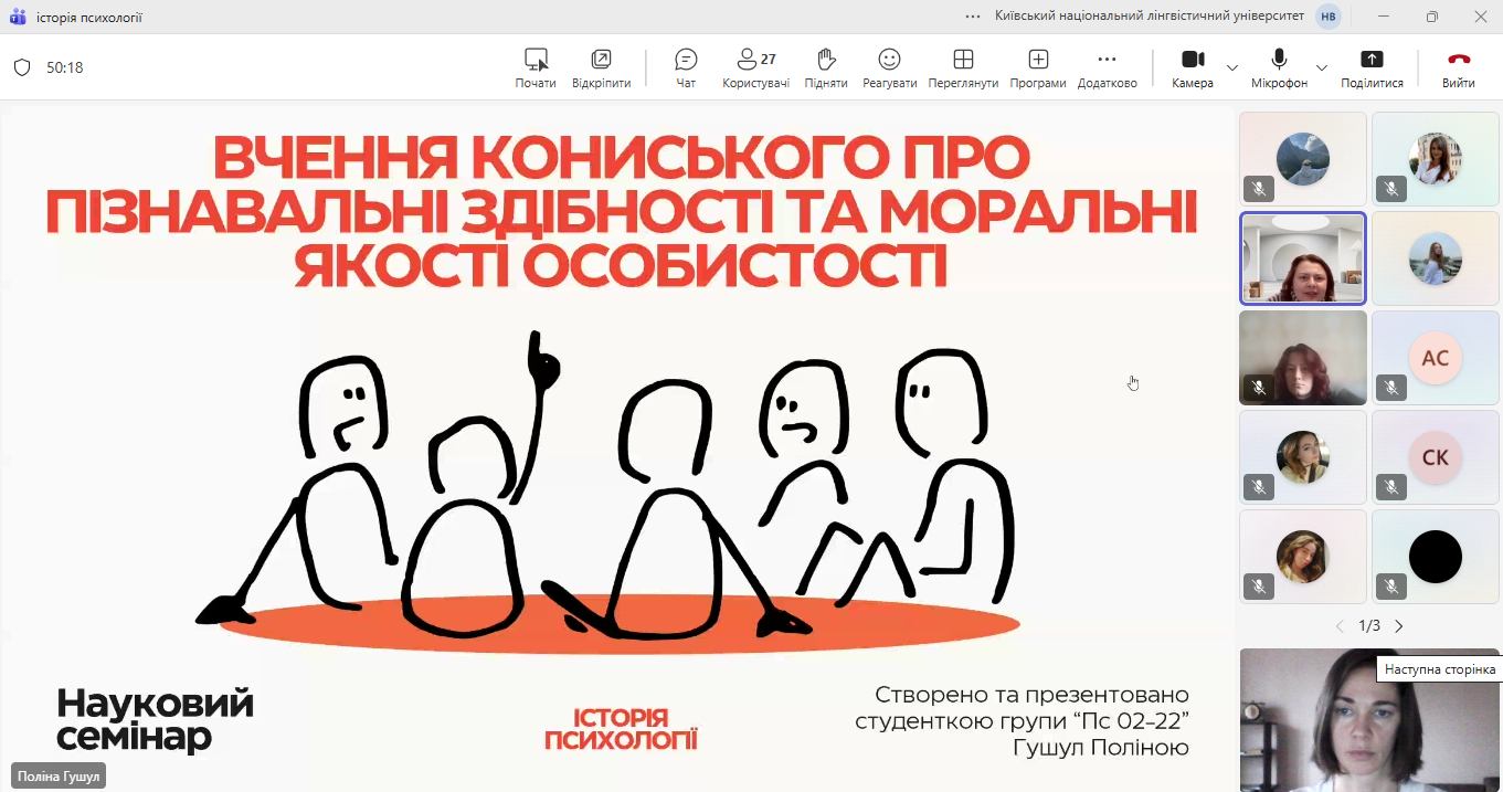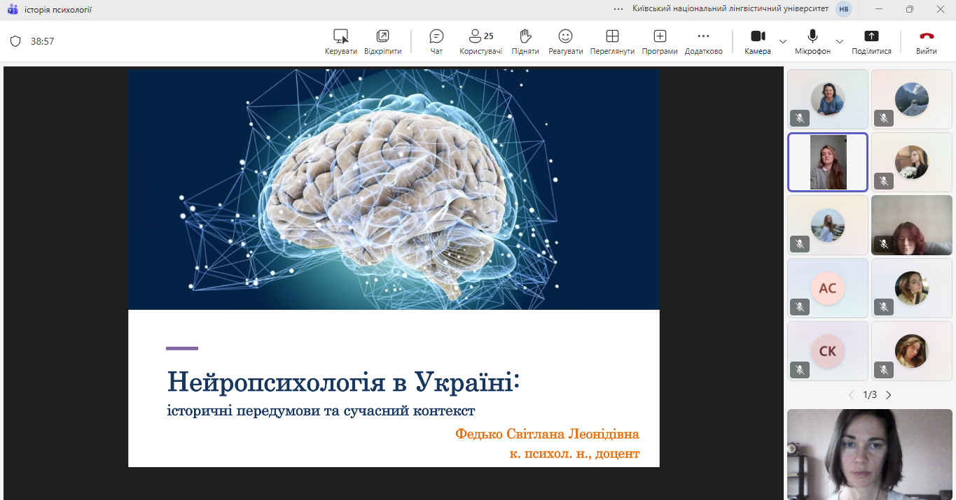 20 листопада 2025 р. у Київському національному лінгвістичному університеті було проведено (у форматі онлайн) науковий семінар «Витоки київської психологічної школи», присвячений аналізу історичних передумов формування психологічної науки в Україні та внеску провідних дослідників у становлення національної академічної традиції.