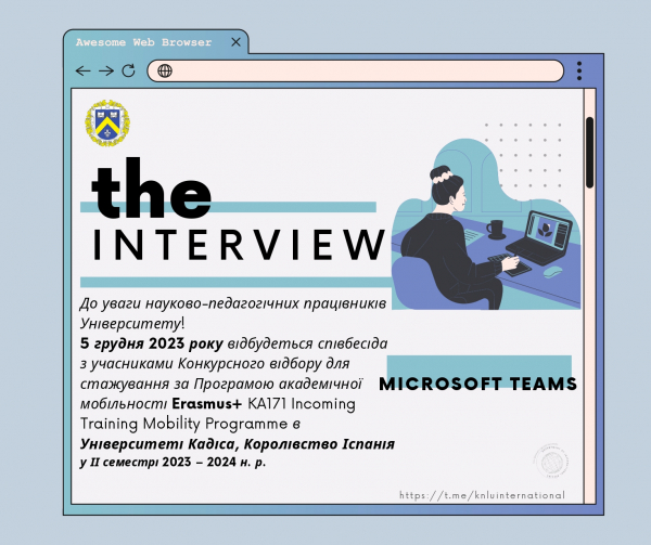 Співбесіда з науково-педагогічними працівниками Університету для проходження стажування за Програмою міжнародної академічної мобільності Erasmus+ KA171 Incoming Training Mobility Programme в Університет Кадіса, Королівство Іспанія