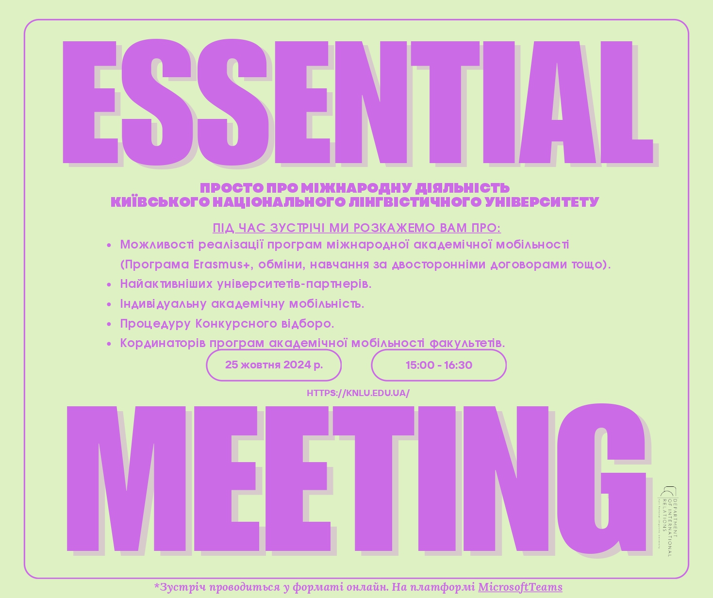Раді повідомити вам, що представники відділу міжнародних зв’язків КНЛУ підготували для вас презентацію про міжнародну діяльність Університету. Під час зустрічі буде висвітлена інформація про: