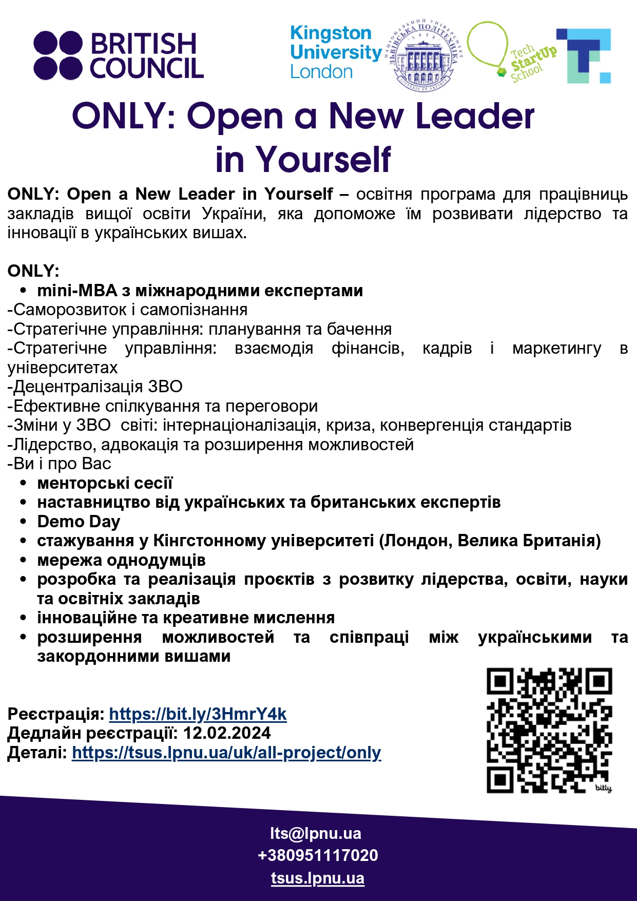 - ONLY: Open a New Leader in Yourself – освітня програма для працівниць закладів вищої освіти України, яка допоможе їм розвивати лідерство та інновації в українських вишах.