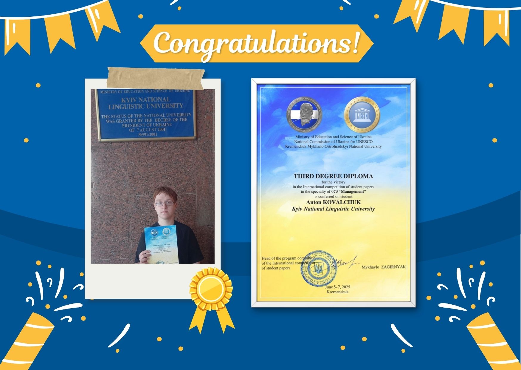 студента факультету туризму, бізнесу і психології Ковальчука Антона, який здобув диплом ІІІ ступеня зі спеціальності 073 «Менеджмент».