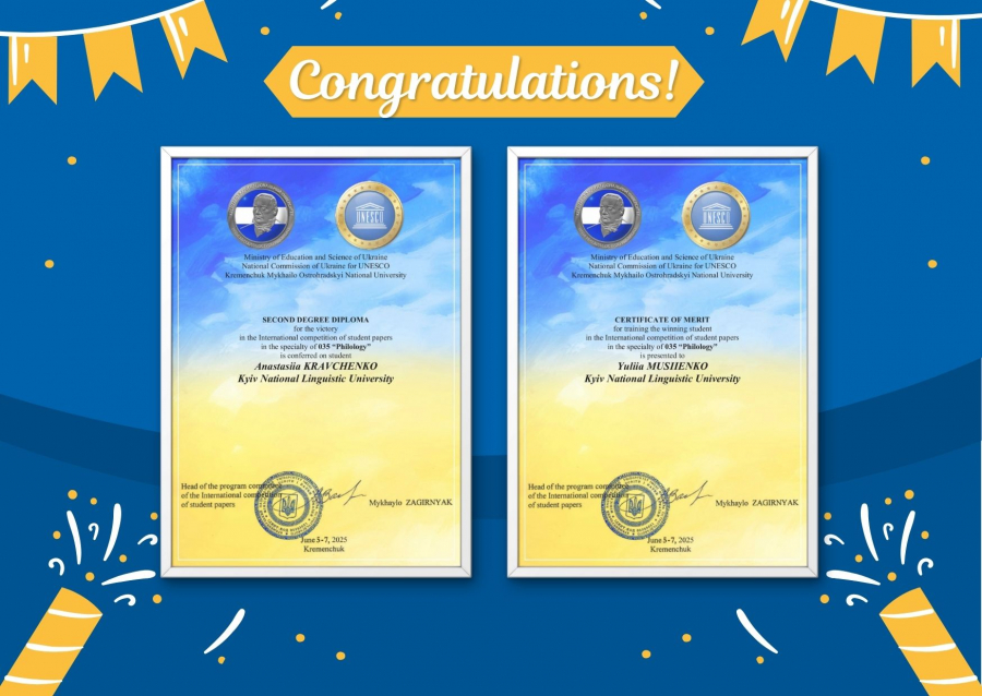 студентку факультету германської філології і перекладу Анастасію Кравченко, яка здобула диплом ІІ ступеня зі спеціальності 035 «Філологія»;